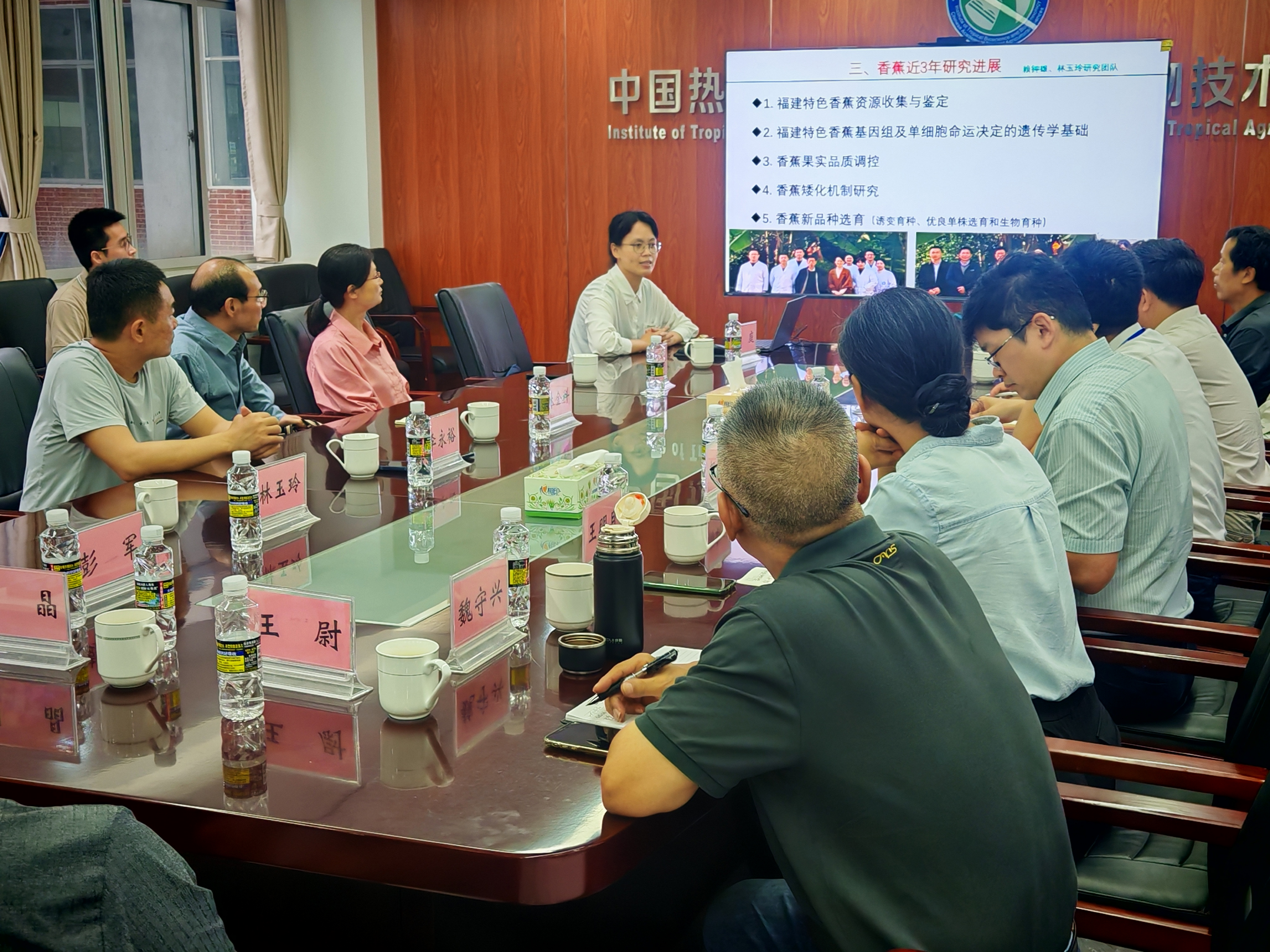 会上,参会双方展开深入交流与探讨。福建农林大学果树研究所所长、厦门综合试验站核心成员林玉玲教授系统汇报了团队近三年来的研究进展,主要包括:福建特色香蕉资源收集与鉴定、福建特色香蕉基因组及单细胞命运决定的遗传学基础、香蕉果实品质调控、香蕉矮化机制研究、香蕉新品种选育(诱变育种、优良单株选育和生物育种)等方面内容。随后,国家香蕉产业技术体系各岗位专家刘菊华研究员、李敬阳研究员、王明月研究员、彭军研究员分别围绕品种改良、育种技术、品质评价、病害防控等方向介绍最新研究成果,并就福建产区面临的品种适应性、病虫害绿色防控等难题提出技术建议。儋州综合试验站站长魏守兴还分享了海南香蕉集约化栽培经验,为福建产区提供技术参考。王尉研究员则就栽培生理岗站与厦门综合试验站的高度协同性,提出联合研发矮化品种配套栽培技术。