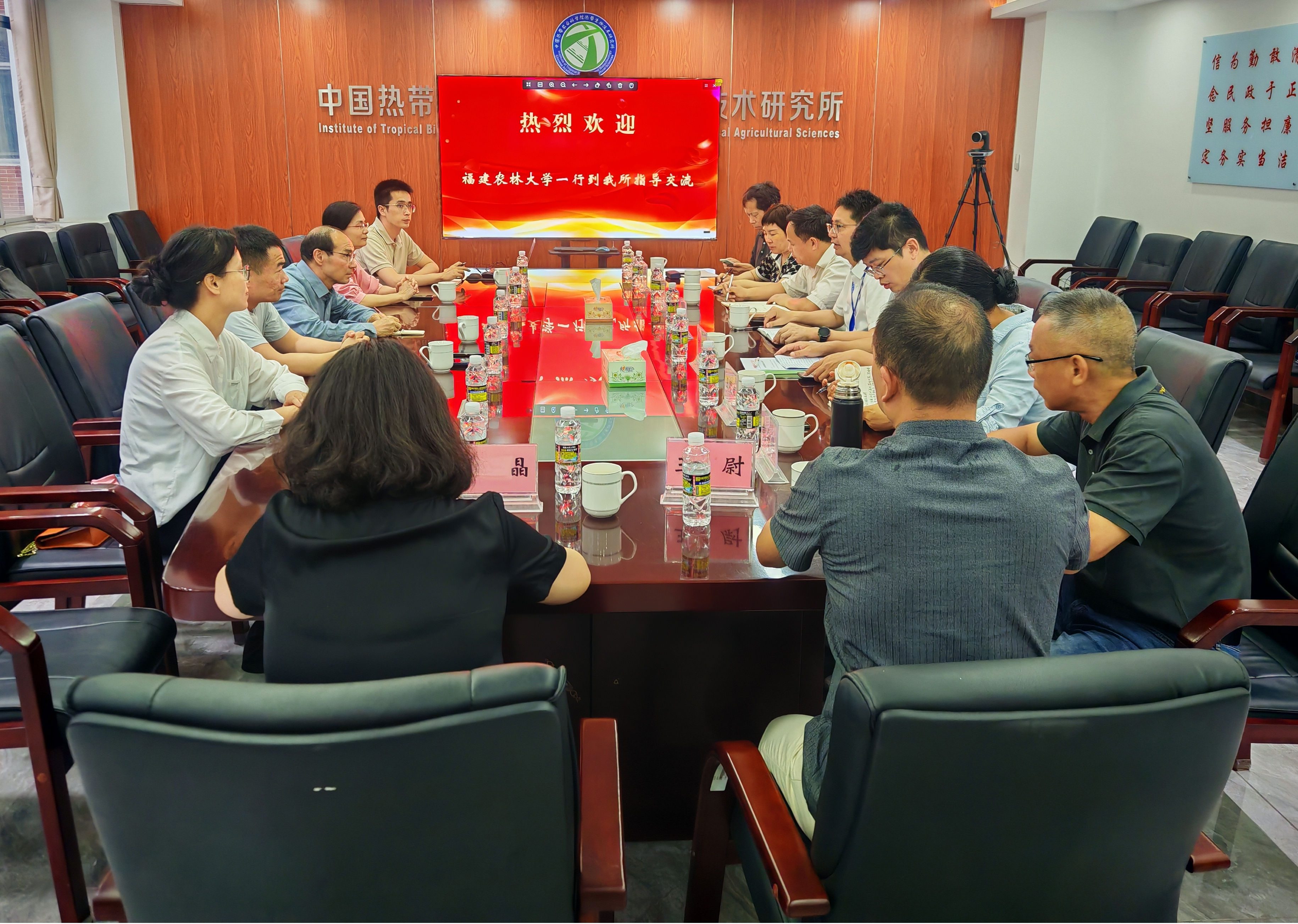 2025年4月28日,福建农林大学园艺学院院长林金科、副院长曾黎辉,果树所所长林玉玲,园艺系系主任李永裕,园艺遗传育种教研部主任方庭一行5人莅临中国热带农业科学院热带生物技术研究所(以下简称“热科院生物所”)进行科研合作交流。中国热带农业科学院副院长、国家香蕉产业技术体系(以下简称“体系”)首席科学家谢江辉研究员,热科院生物所所长郝朝运研究员,以及体系岗站专家、首席办成员和热科院生物所科技处负责人等20余人出席座谈。双方围绕热带作物研究、人才培养、技术协同创新等议题展开深入探讨,旨在推动科校深度融合,服务热带农业高质量发展。